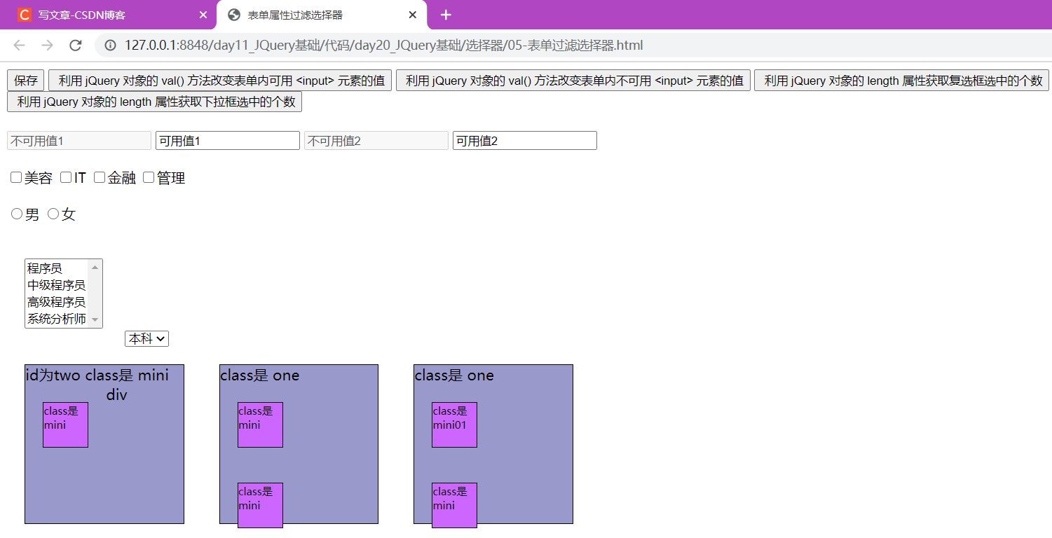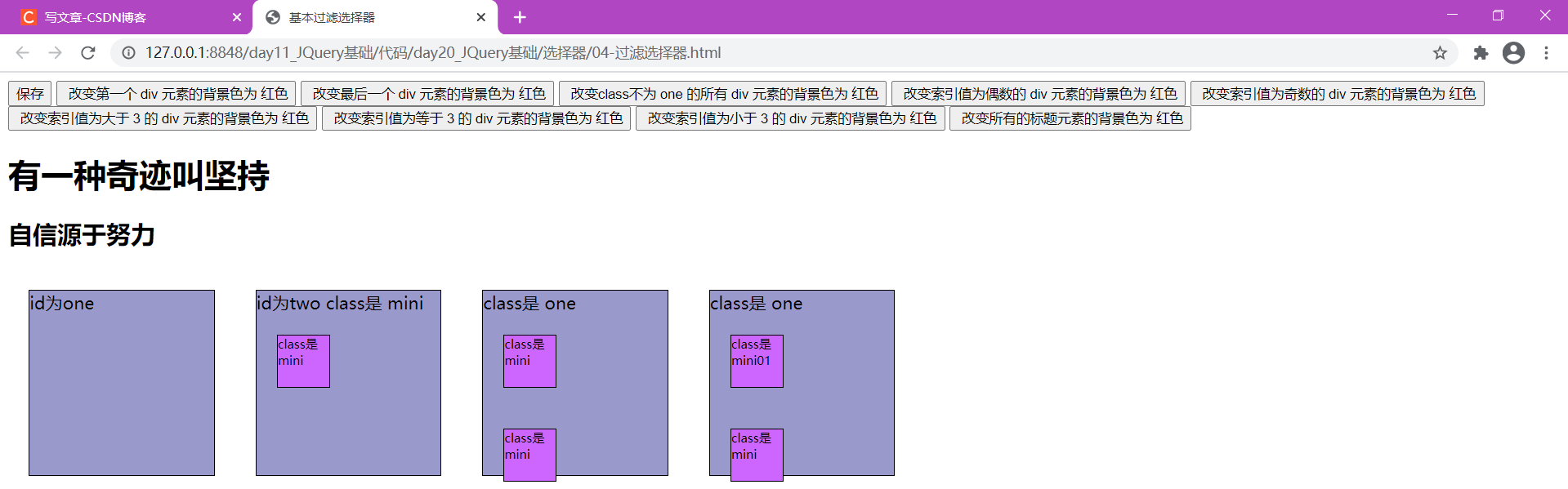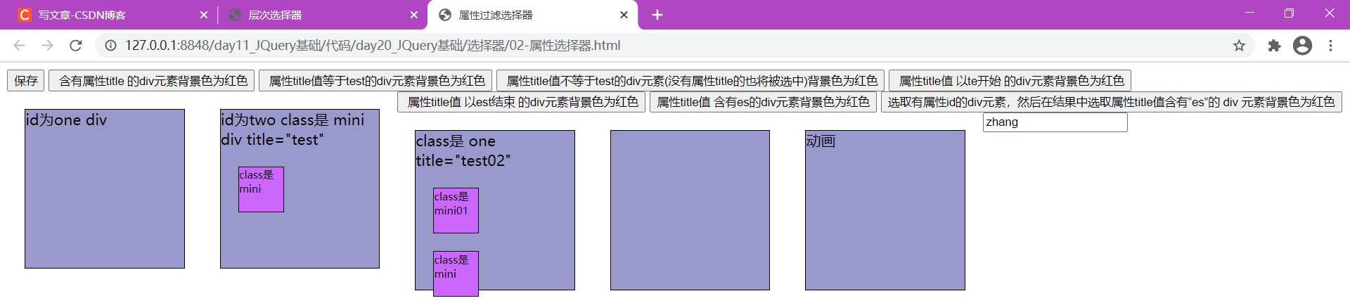 属性过滤选择器 id为one divid为two class是 mini div title="test"class是 miniclass是 oneclass是 miniclass是 miniclass是 one title="test02"class是 mini01class是 mini这是隐藏的动画