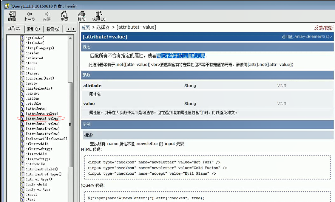 * 语法: $("A[属性名='值']") 包含指定属性等于指定值的选择器
