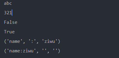 def demo2():# 字符串一些操作a = ' abc 'b = '123'print(a.strip()) # 去除首位空格print(''.join(reversed(b))) # 字符串反转print(a.isdigit()) # 判断字符串是否只包含数字print(b.isdigit())c = 'name:ziwu'# 通过res[-1]拿到最后值,判断是否存在某个符号print(c.partition(':')) # ('name', ':', 'ziwu')print(c.partition('.')) # ('name:ziwu', '', '')