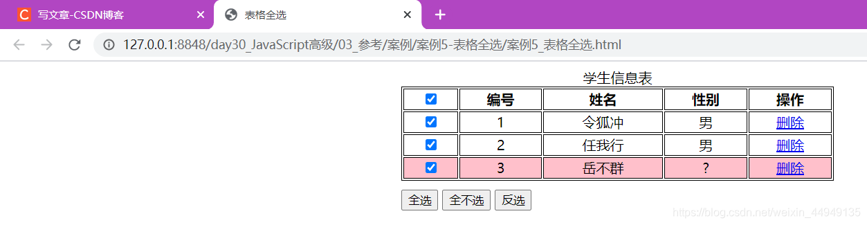 学生信息表 编号 姓名 性别 操作 1 令狐冲 男 删除 2 任我行 男 删除 3 岳不群 ? 删除