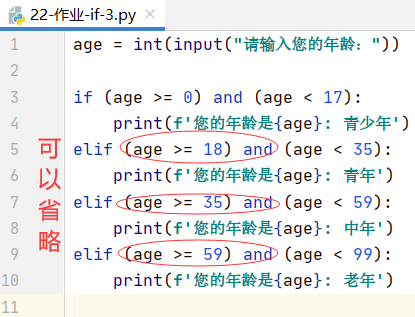 elif (age >= 18) and (age < 35):print(f'您的年龄是{age}: 青年')