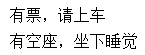 if ticket == 1:print('有票,请上车')if seat == 1:print('有空座,坐下睡觉')else:print('没座位,站着睡')