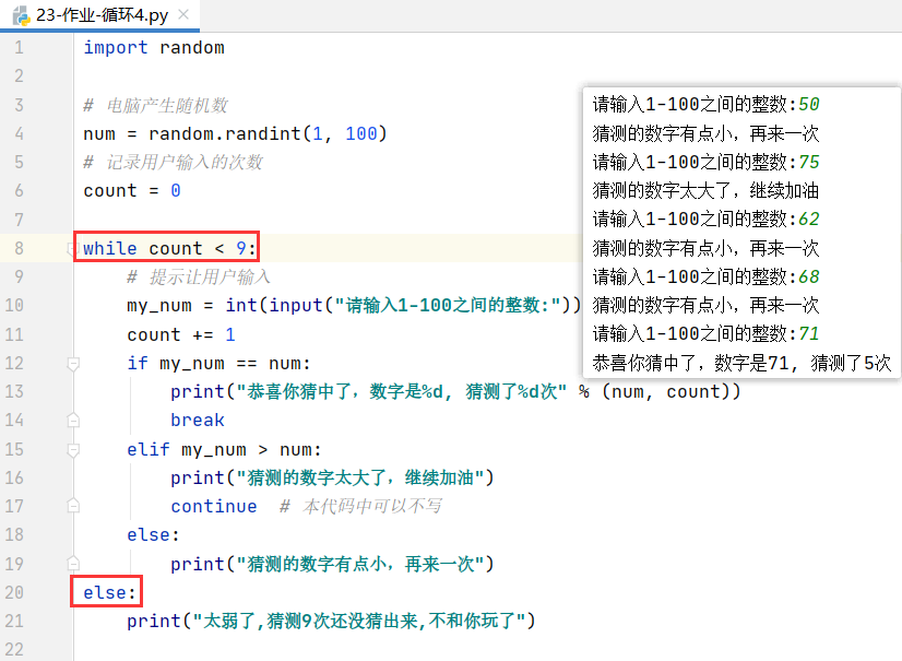 count = 0while count < 5:# 提示让用户输入my_num = int(input("请输入1-100之间的整数:"))count += 1if my_num == num:print("恭喜你猜中了,数字是%d, 猜测了%d次" % (num, count))breakelif my_num > num:print("猜测的数字太大了,继续加油")continue # 本代码中可以不写else:print("猜测的数字有点小,再来一次")