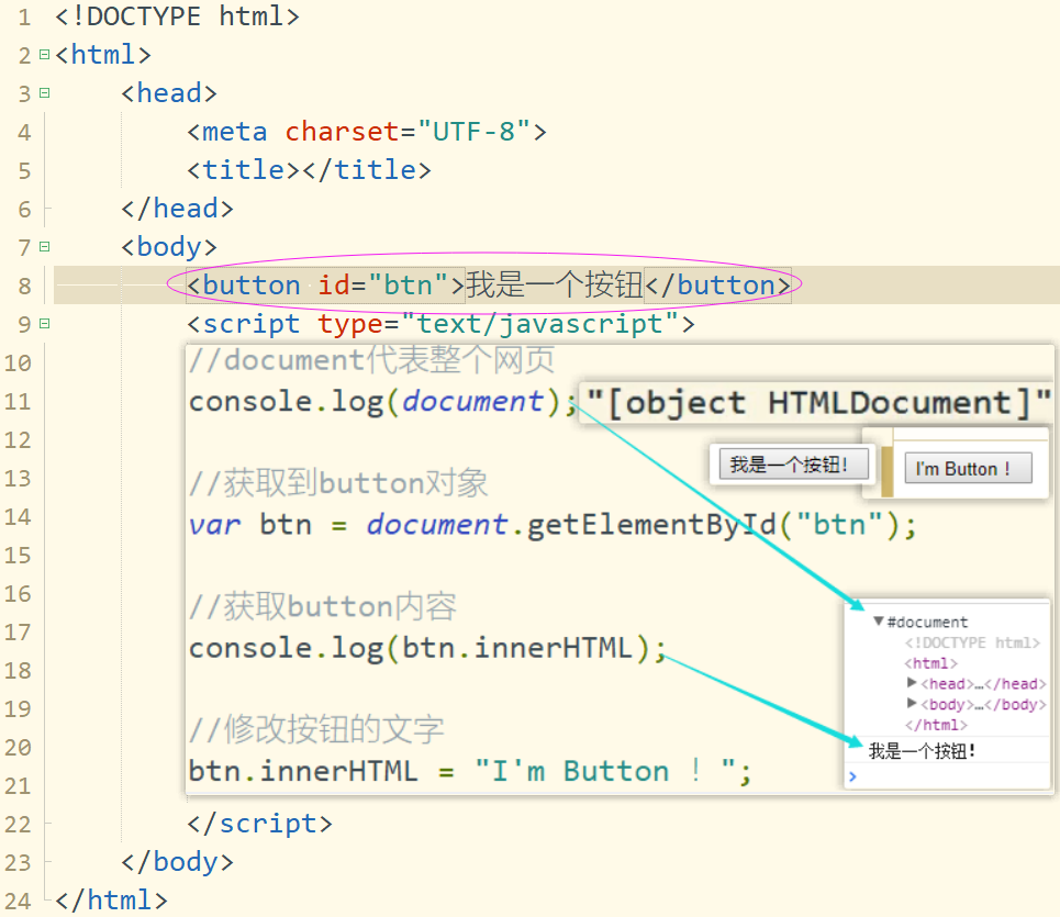 浏览器已经为我们提供 文档节点 对象,这个对象是window属性,可以在页面中直接使用,文档节点代表的是整个网页。
