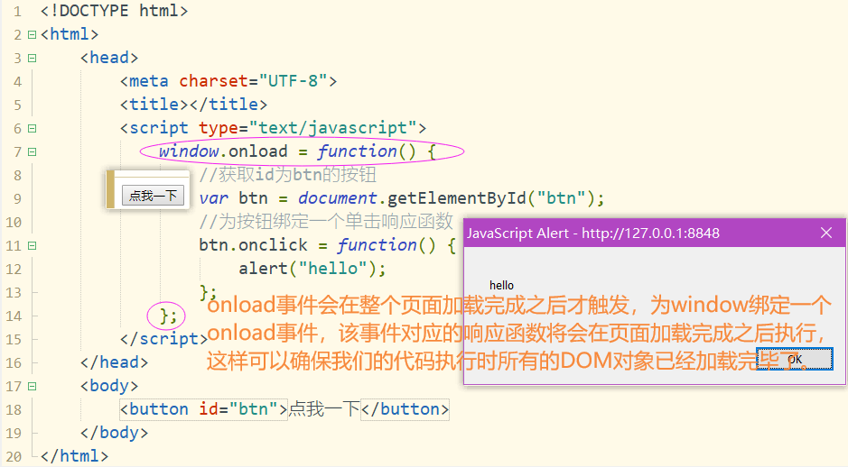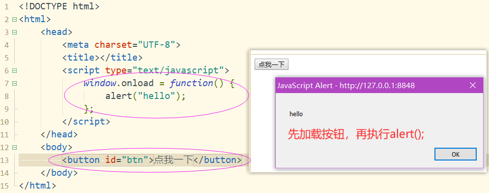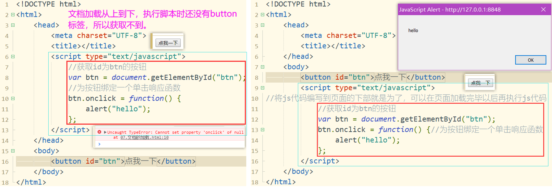 如果将script标签写到页面的上边,在代码执行时,页面还没有加载,页面没有加载 DOM对象也没有加载,会导致无法获取到DOM对象。