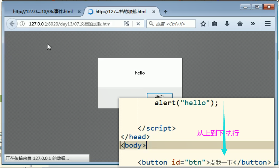浏览器在加载一个页面时,是按照自上向下的顺序加载的,读取到一行就运行一行。