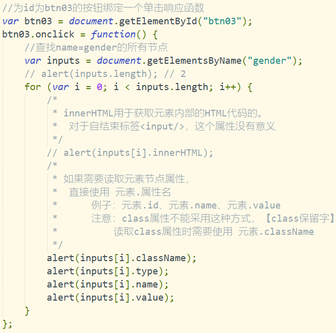- 获取,元素对象.属性名。例:element.value、element.id、element.className