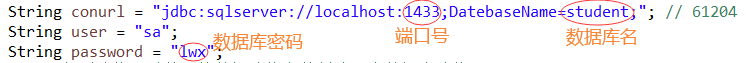 import java.sql.SQLException;public class DBConnection {Connection con = null; // 保存数据库连接的成员变量public Connection getConnection() {try {Class.forName("com.microsoft.sqlserver.jdbc.SQLServerDriver"); // 1、加载驱动System.out.println("驱动成功!!!"); // 提示信息String conurl = "jdbc:sqlserver://localhost:1433;DatebaseName=student;"; // 61204String user = "sa";String password = "lwx";// 2、得到连接:以获取的数据连接参数创建一个数据库连接con = DriverManager.getConnection(conurl, user, password);System.out.println("数据库连接成功了!!!");} catch (ClassNotFoundException e) {System.out.println("驱动失败!!!"); // 对驱动没有成功地加载时抛出的异常处理} catch (SQLException e) {System.out.println(e.getMessage());System.out.println("连接失败!!!"); // 对连接失败时抛出的异常处理}return con; // 返回数据库连接对象}public void closeConnection() {if (con != null) {try {con.close(); // 关闭数据库连接System.out.println("关闭成功!!!");} catch (SQLException e) {System.out.println("关闭失败!!!");System.out.println(e.getMessage());}}}public static void main(String[] args) {DBConnection connection = new DBConnection();connection.getConnection();connection.closeConnection();}}