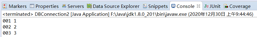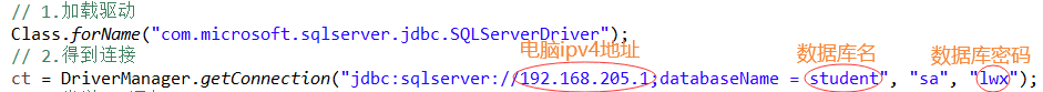 package sjk;import java.sql.*;public class DBConnection2 {public static void main(String[] args) {Connection ct = null;PreparedStatement ps = null;ResultSet rs = null;try {// 1.加载驱动Class.forName("com.microsoft.sqlserver.jdbc.SQLServerDriver");// 2.得到连接ct = DriverManager.getConnection("jdbc:sqlserver://192.168.205.1;databaseName = student", "sa", "lwx");// 3.发送sql语句ps = ct.prepareStatement("select * from test");// 4.执行rs = ps.executeQuery();// 循环取出数据表中的字段值while (rs.next()) {String name = rs.getString(1);String age = rs.getString(2);System.out.println(name + " " + age);}} catch (Exception e) {e.printStackTrace();// TODO: handle exception} finally {try {rs.close();ps.close();ct.close();} catch (SQLException e) {// TODO Auto-generated catch blocke.printStackTrace();}}}}