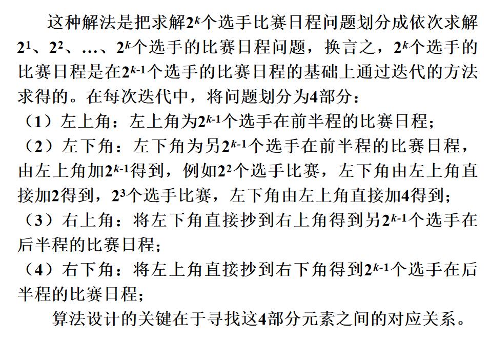 分治法【锦标赛问题:设计一个满足以下要求的比赛日程表: (1)每个选手必须与其他n-1个选手各赛一次; (2)每个选手一天只能赛一次; (3)循环赛一共进行n-1天。】