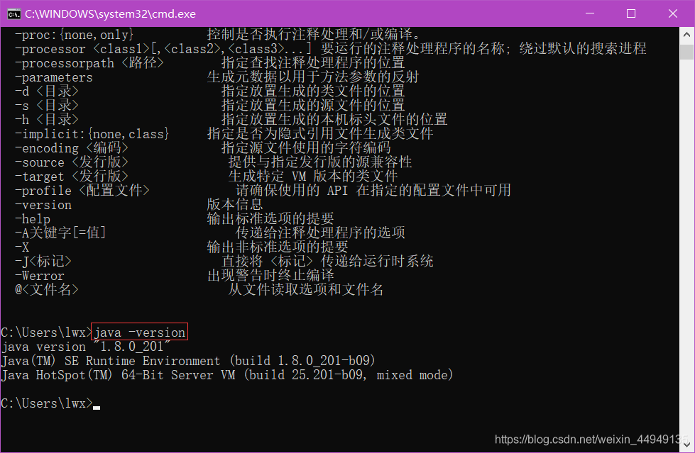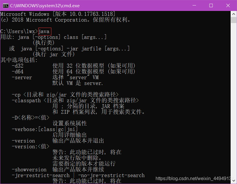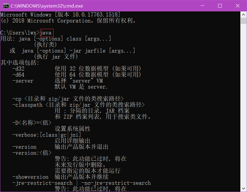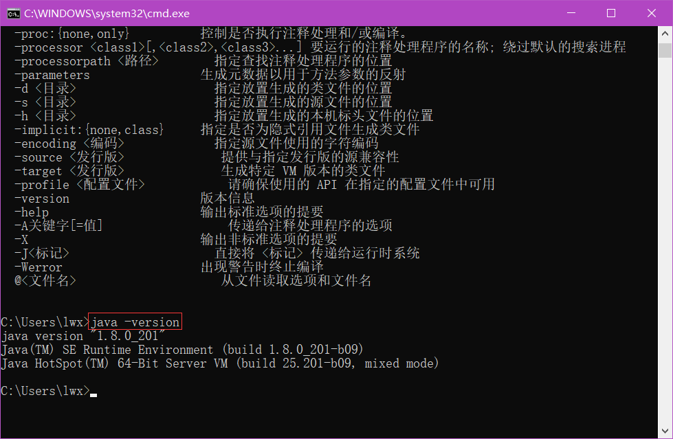 3、命令行输入“java -version”进行测试——参看jdk版本