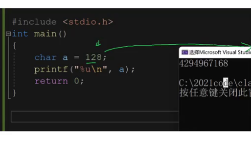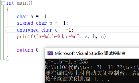c的补码变成了000000000000000000000000011111111。由于高位补0因此c为正的原码补码反码相同。加上由于输出是%d因此输出的是原码;可得到运行结果