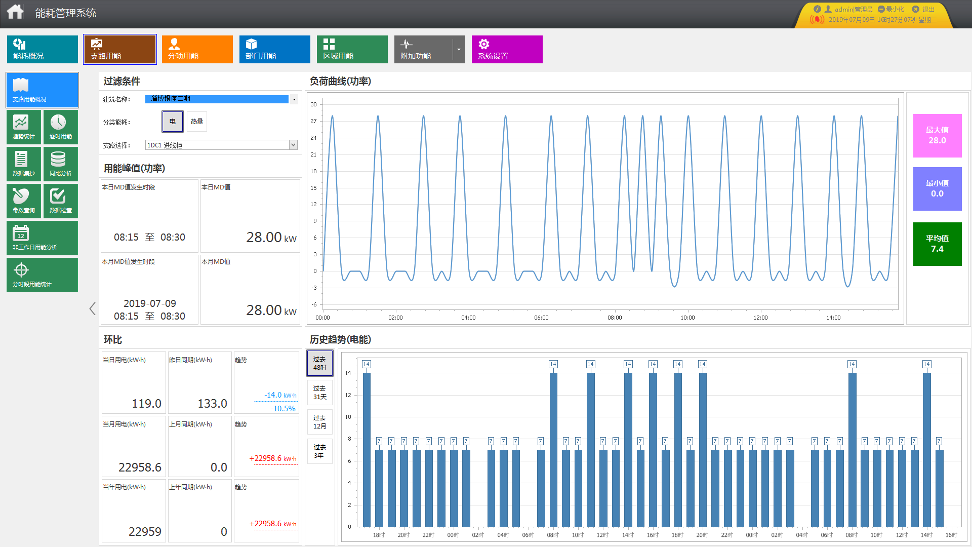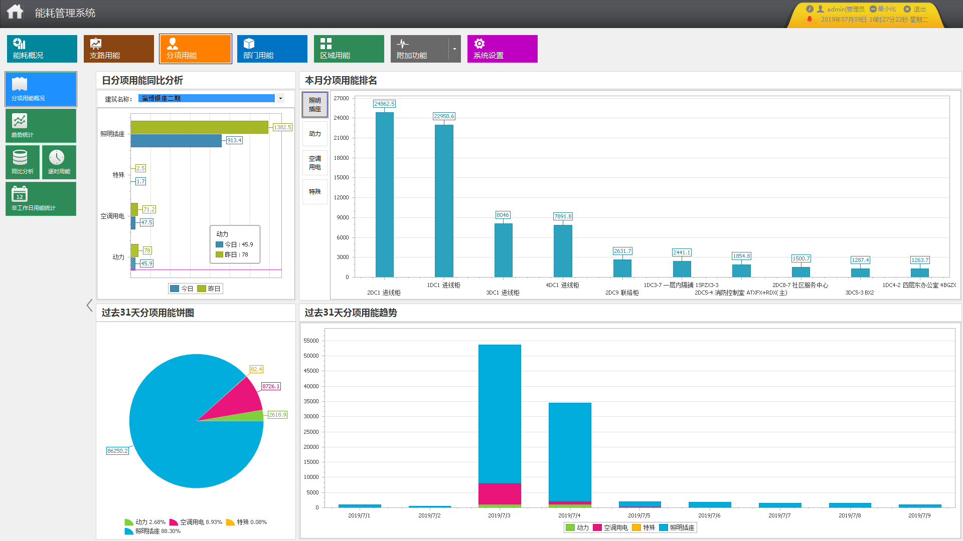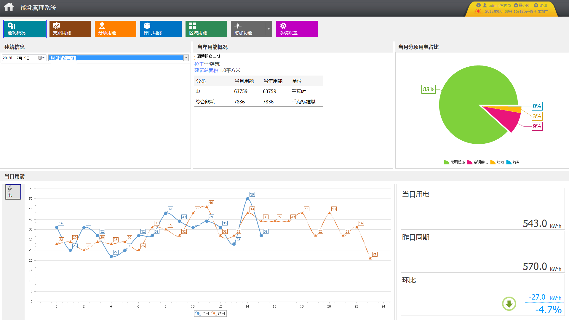 反映某分类能耗(例如电)当日及昨日同期、当月及上月同期、当年及上年同期的用能及对比,增长百分比及增加值; 反映某分类能耗过去48小时、过去31天、过去12个月、过去3年的用能趋势; 反映某分项能耗的当月用能饼图; 反映某分类能耗当年各月用能同比分析图;