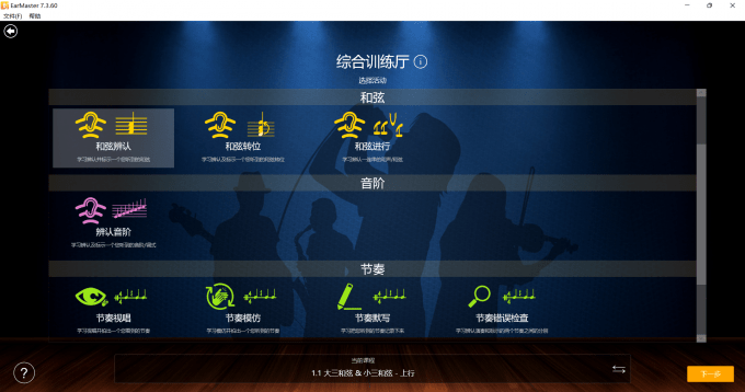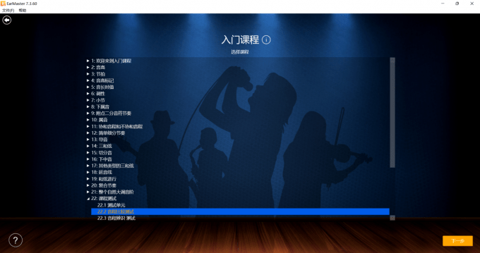 理论知识学习是我们开始视唱练耳学习的第一步,因此,在使用Earmaster时,我们应该先进行理论知识的学习,在软件的主界面中点击“入门课程”即可进入到Earmaster的理论课程界面。