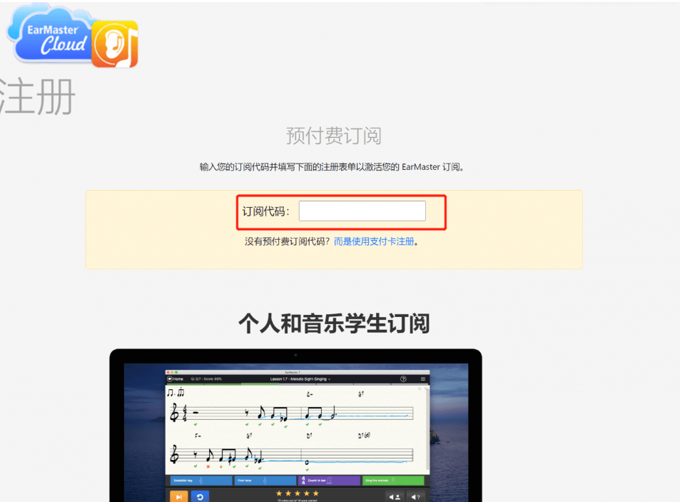 (2)当我们下载好EarMaster软件并安装,然后打开网址:EarMaster Subscription Signup ,务必要在下图位置输入您的订阅代码,订阅代码可以在里百度网盘或者中文官网获得,通常是3段数字和字母的组合,共计15个字符。