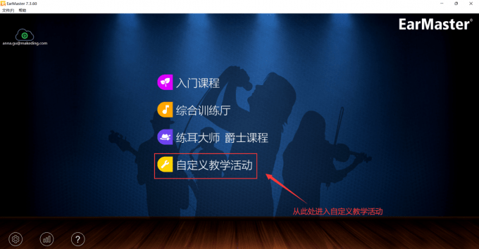 Earmaster支持学生针对某个具体的音程或者和弦进行自定义练习,通过不断重复对某个具体音程、和弦的学习,来达到加强记忆、补齐短板的目的,我们可以在Earmaster的主界面中找到“自定义教学活动”,即可进入到Earmaster的自定义教学中。