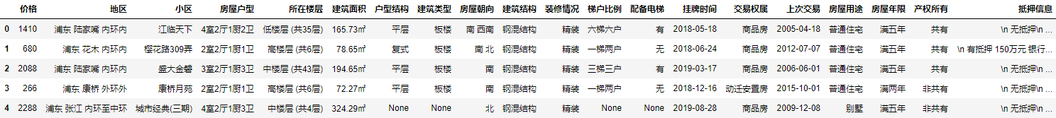 首先我们看一下爬取的数据。维度不是太多,但是有些列我们可以拆分,例如地区、所在楼层、抵押信息等。