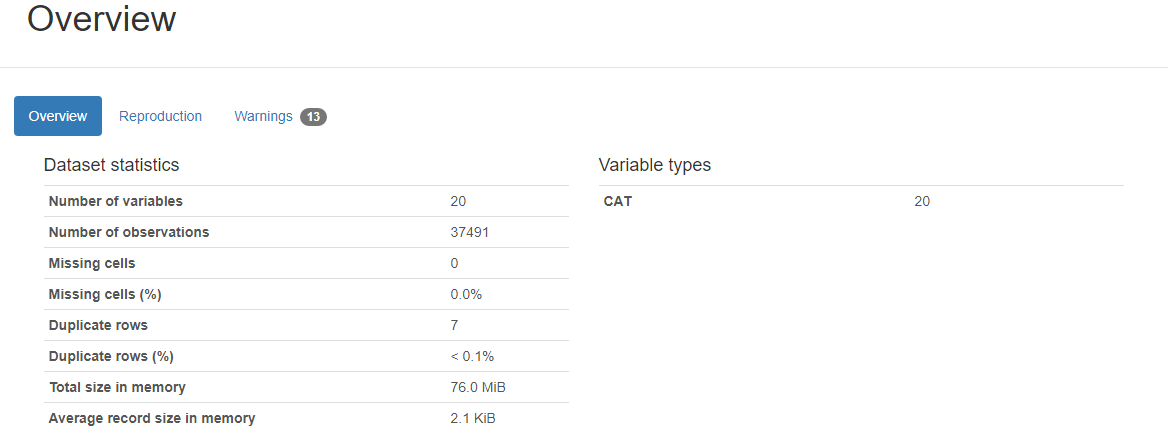 根据报告内容我们可以看到本次数据总共有37491行,20列,存在7行重复,重复占比小于0.1%,报告继续下拉可以看到每一列的统计情况。