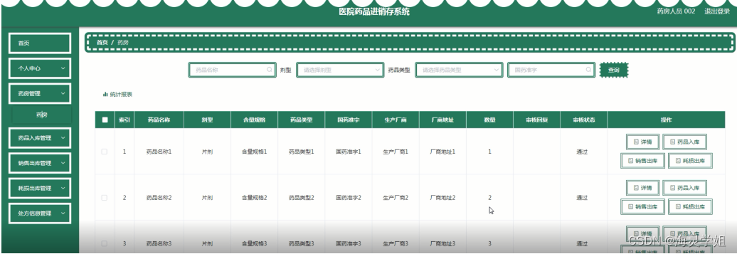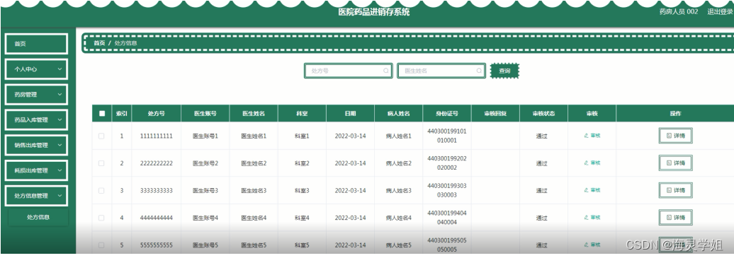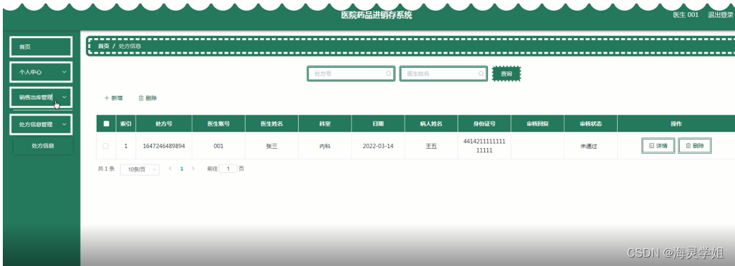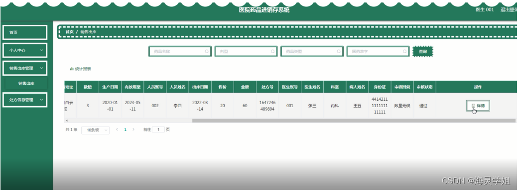 销售出库管理:医生通过销售出库管理页面可以查看药品名称、剂型、含量规格、药品类型、国药准字、生产厂商、厂商地址、数量、生产日期、有效期至、人员账号、人员姓名、出库日期、售价、金额、处方号、医生账号、医生姓名、科室、病人姓名、身份证、审核回复、审核状态等操作,如图5-3所示。