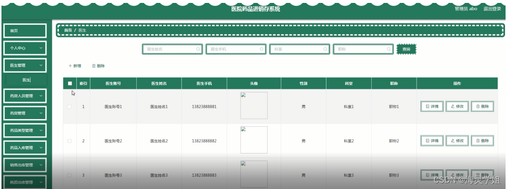 医生管理,管理员在医生管理页面可以查看医生账号、医生姓名、医生手机、头像、性别、科室、职称等内容,并可根据需要对医生管理进行修改或删除等操作,如图5-11所示。