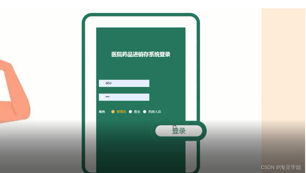 医生登录;在医生登录页面填写用户名、密码、选择角色进行登录,如图5-1所示。
