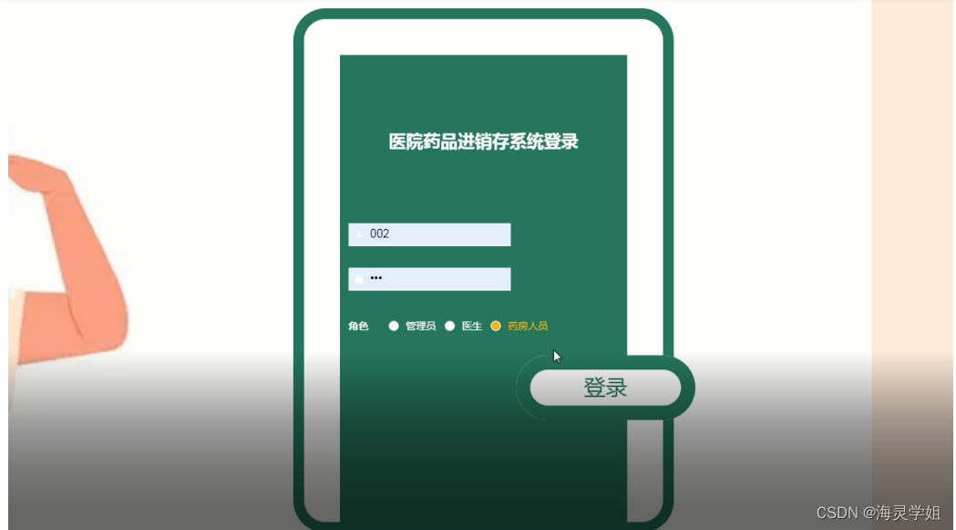 药房人员登录;在药房人员登录页面填写用户名、密码、选择角色进行登录,如图5-5所示。