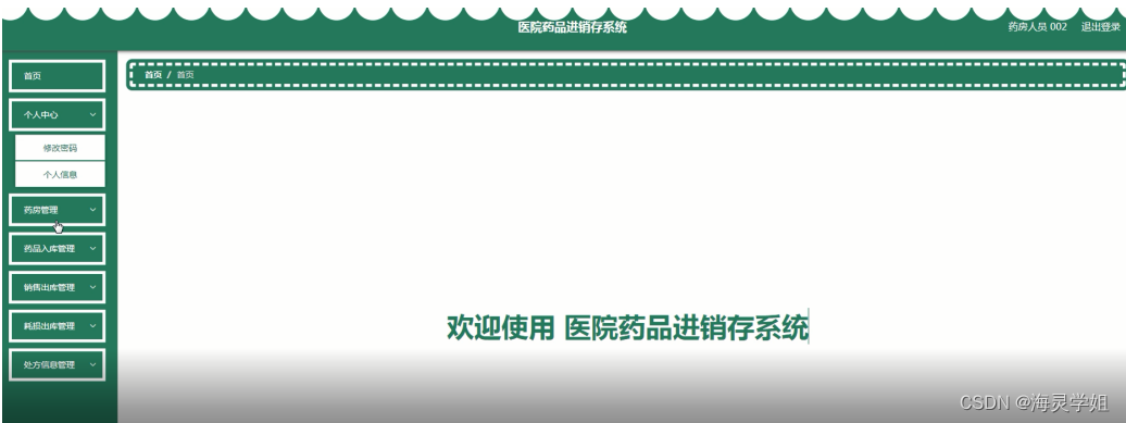 药房人员登录进入医院药品进销存系统可以查看首页、个人中心、药房管理、药品入库管理、销售出库管理、耗损出库管理、处方信息管理等内容,如图5-6所示。