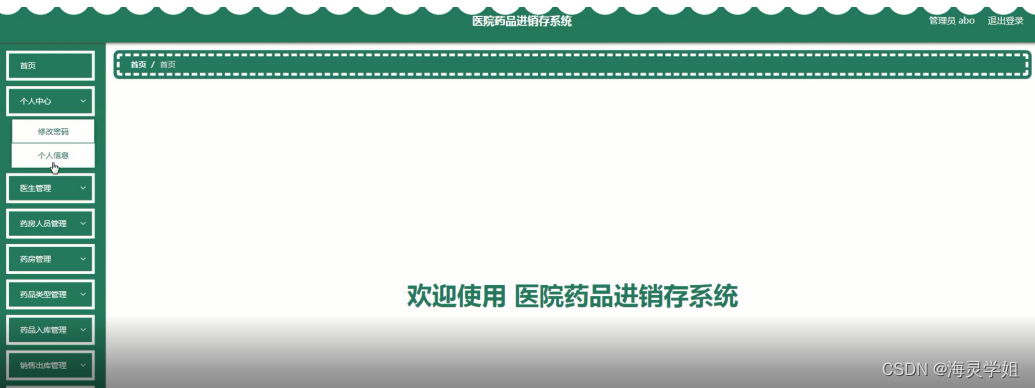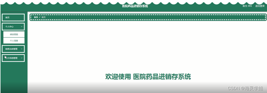 医生登录进入医院药品进销存系统可以查看首页、个人中心、销售出库管理、处方信息管理等内容,如图5-2所示。