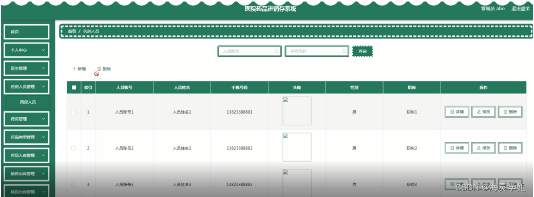 药房人员管理,管理员在药房人员管理页面可以查看人员账号、人员姓名、手机号码、头像、性别、职称等内容,并可根据需要对药房人员管理进行修改或删除等操作,如图5-12所示。