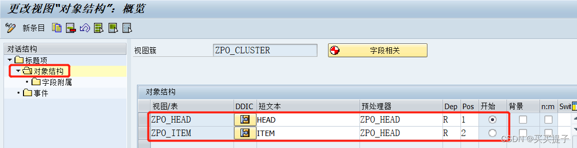 之后先选中“ZPO_HEAD”行,点击右上角的按钮“字段相关”,完成后系统会提示“字段相关性已完成”的信息。其次选中“ZPO_ITEM”行,点击左边的“字段附属”按钮,维护好两个Table之间的对应关系(通过外键将Head表和Item表联系起来)。