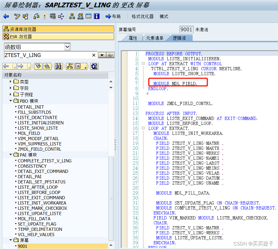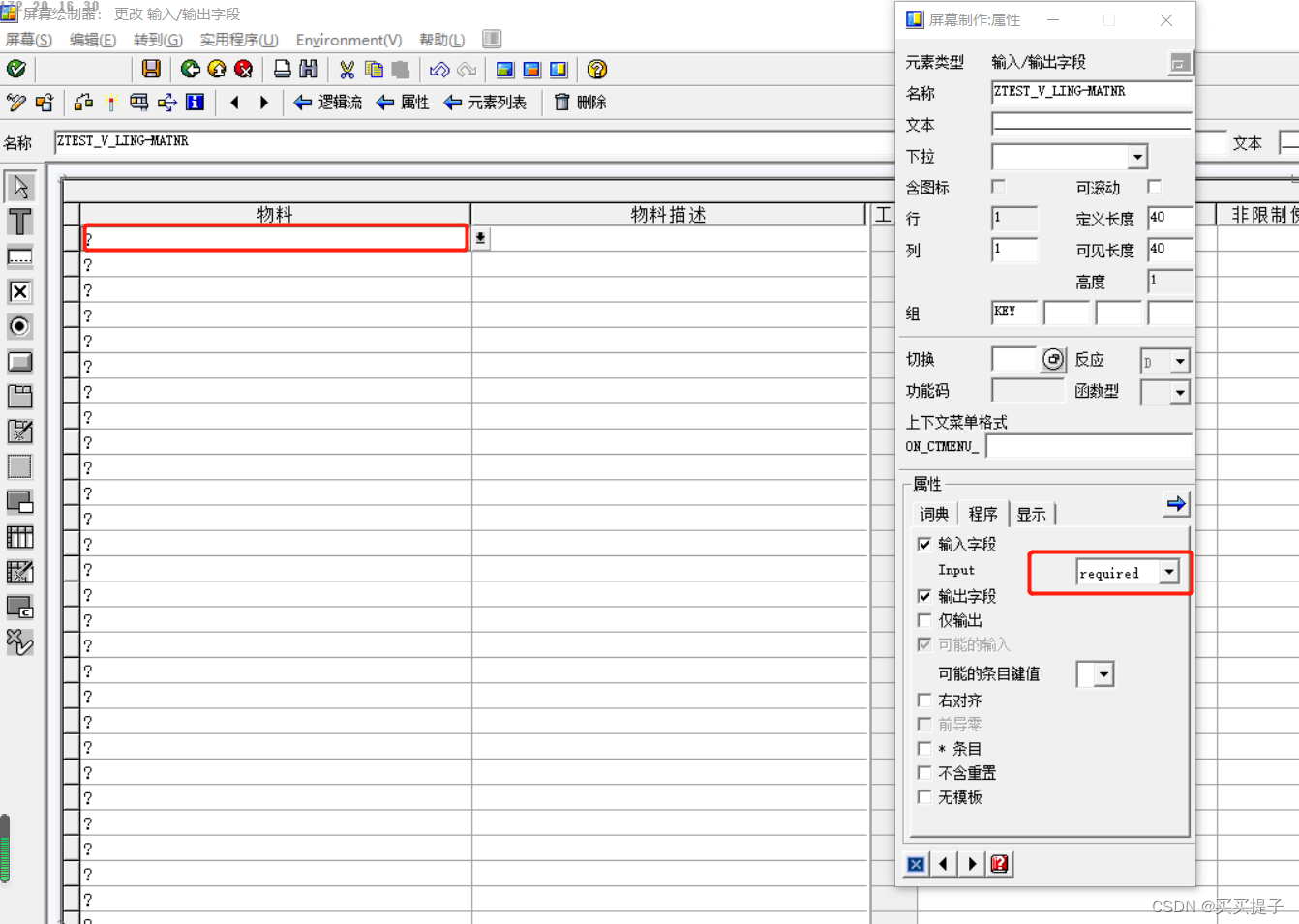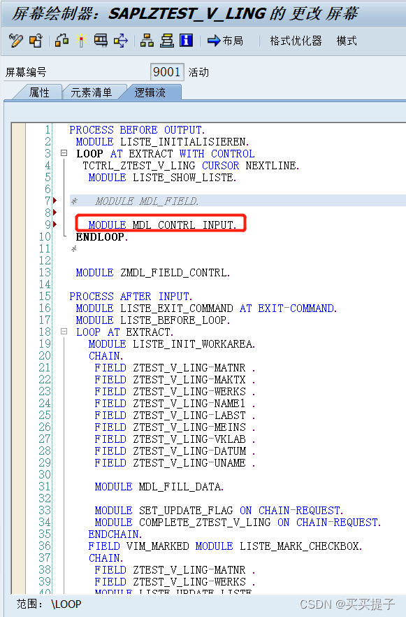 MODULE MDL_CONTRL_INPUT OUTPUT.DATA:LV_MATRN TYPE MATNR.LV_MATRN = ZTEST_V_LING-MATNR .SHIFT LV_MATRN LEFT DELETING LEADING '0'.IF LV_MATRN = '100840'.LOOP AT SCREEN.IF SCREEN-NAME = 'ZTEST_V_LING-DATUM'.SCREEN-INPUT = 0. "不可输入状态MODIFY SCREEN.ENDIF.ENDLOOP.ENDIF.
