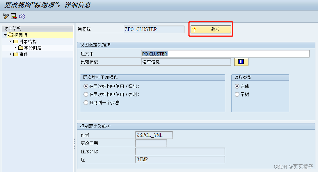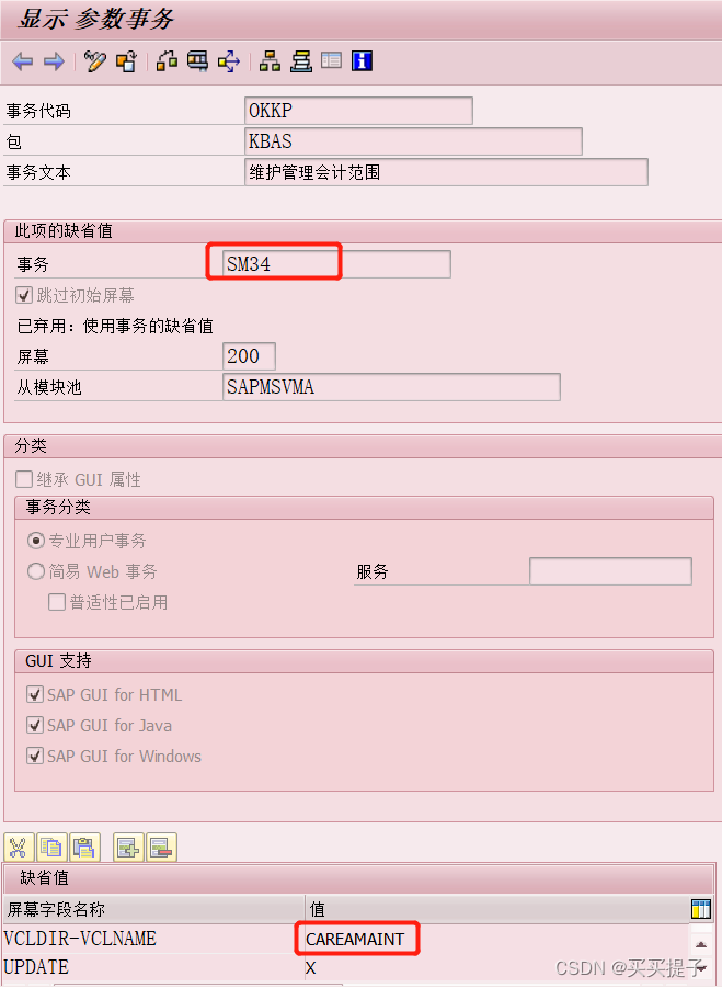 我们不妨用事务代码SE93查看上述事务代码,可以看到维护视图簇是调用了事务代码SM34,也就是说将来创建了视图簇可以用该事务代码进行维护(或者创建单独的事务代码)。