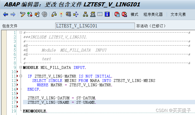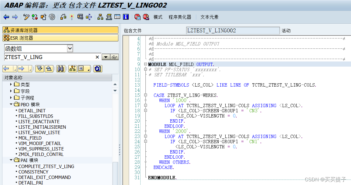 MODULE MDL_CHANGE_DATE INPUT.FIELD-SYMBOLS TYPE ANY.FIELD-SYMBOLS TYPE ANY.FIELD-SYMBOLS TYPE ANY.LOOP AT EXTRACT ASSIGNING ."按物料做主键(表维护程序前台工厂必输)ASSIGN COMPONENT 'MATNR' OF STRUCTURE TO .CHECK = ZTEST_V_LING-MATNR.ASSIGN COMPONENT 'DATUM' OF STRUCTURE TO .IF SY-SUBRC = 0. = ZTEST_V_LING-DATUM.ENDIF.ENDLOOP.