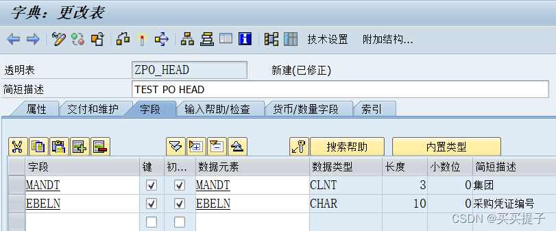 首先得创建有层次关系的两张表,这里我们以新建采购订单的抬头/行项目表为例进行演示。