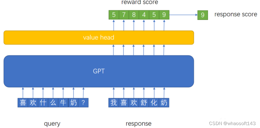 Reward Model相较于原始的SFT Model,在后面加上了一个value head,value head是一个Linear,输入维度为模型的hidden_dim,输出维度为1,输出表示模型预测每一字符获取的得分。DeepSpeed-Chat中使用最后一个字符的得分作为整个response的得分(当然也可以使用整个句子中每个字符的平均分作为整体的得分)。