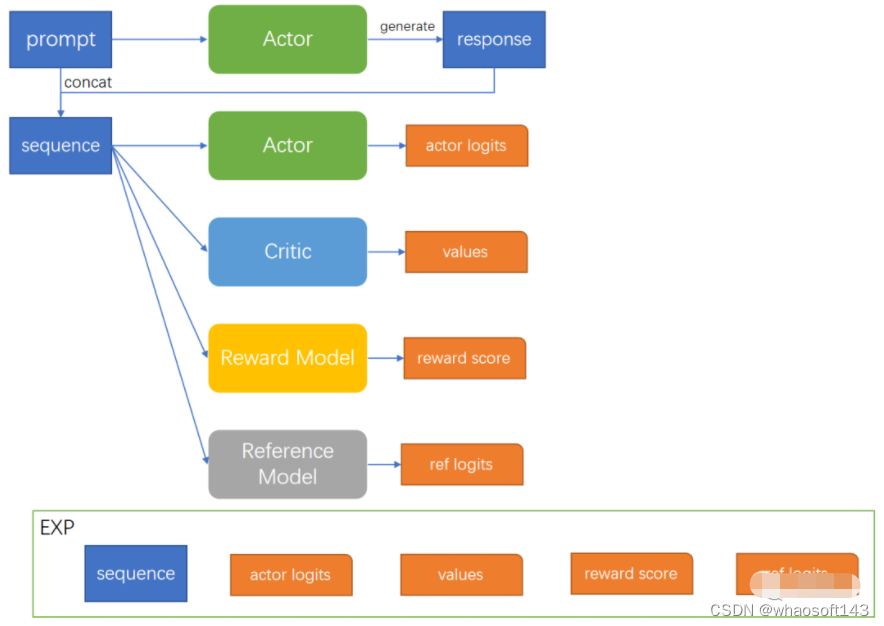 首先是make_experience,首先在训练数据中抽取一部分query,然后Actor Model生成答案。然后我们依据这条答案获取我们所需要的经验: