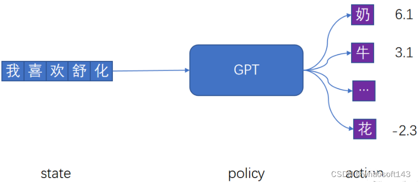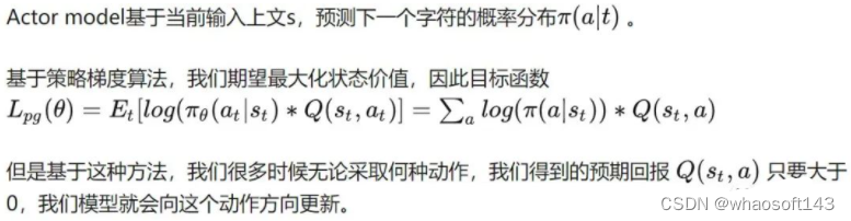 Actor Model:由SFT之后的模型初始化而来。作为策略(policy)模型,用于接收上文,做出动作,预测下一个字符。学习完毕之后,我们最终使用的就是这个模型。