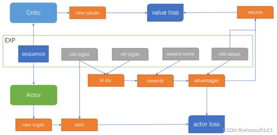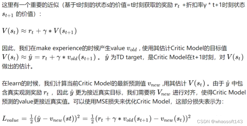 具体的原因是:训练后期,随着模型输出答案越来越好,我们的reward值也会越来越高,导致我们最终累计回报return的区间也会越来越大。而前面说过,我们Critic Loss是一个MSE损失,因此训练后期,随着return的估计范围越来越大,Critic Model就越难估计。在我训练的过程中,一开始return的范围是在3-4左右,训练后期涨到了18-20,因此我们需要想点办法来约束一下我们的return。whaosoft aiot http://143ai.com