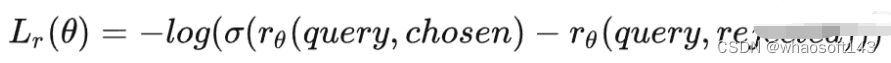 训练Reward Model是一个排序任务,针对query,输入chosen和rejected response,训练目标尽可能的使得chosen和rejected的差值更大,损失函数为: