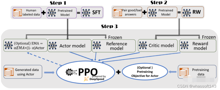 以上就是第三步的核心内容,RL过程整体分为两步,make experience和learn。我们首先采样数据,然后生成结果,Reward Model给出环境的奖励,以及Critic Model对结果进行评判。之后我们依据所获取的经验来对模型进行更新。