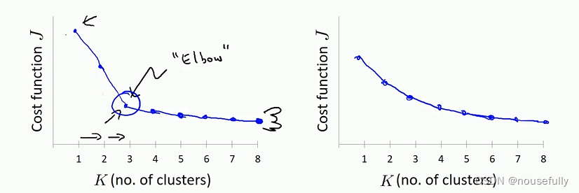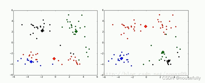 例如,我们上面的算法运行的时候,有可能会得到不同的结果,如下面这两种情况。K-means也是收敛了,只是收敛到了局部最小值: