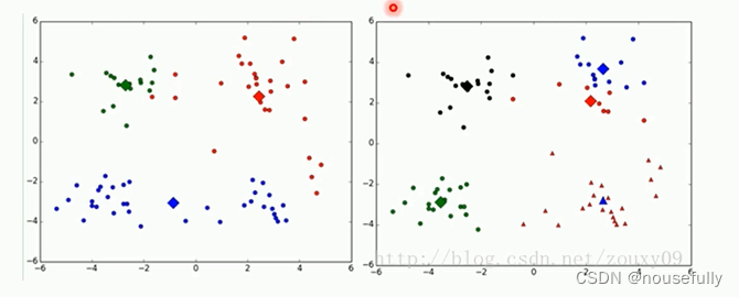 def kmeans(data, k):# 计算样本个数numSamples = data.shape[0]# 样本的属性,第一列保存该样本属于哪个簇,第二列保存该样本跟它所属簇的误差clusterData = np.array(np.zeros((numSamples, 2)))# 决定质心是否要改变的变量clusterChanged = True# 初始化质心centroids = initCentroids(data, k)while clusterChanged:clusterChanged = False# 循环每一个样本for i in range(numSamples):# 最小距离minDist = 100000.0# 定义样本所属的簇minIndex = 0# 循环计算每一个质心与该样本的距离for j in range(k):# 循环每一个质心和样本,计算距离distance = euclDistance(centroids[j, :], data[i, :])# 如果计算的距离小于最小距离,则更新最小距离if distance < minDist:minDist = distance# 更新样本所属的簇minIndex = j# 更新最小距离clusterData[i, 1] = distance# 如果样本的所属的簇发生了变化if clusterData[i, 0] != minIndex:# 质心要重新计算clusterChanged = True# 更新样本的簇clusterData[i, 0] = minIndex# 更新质心for j in range(k):# 获取第j个簇所有的样本所在的索引cluster_index = np.nonzero(clusterData[:, 0] == j)# 第j个簇所有的样本点pointsInCluster = data[cluster_index]# 计算质心centroids[j, :] = np.mean(pointsInCluster, axis = 0)