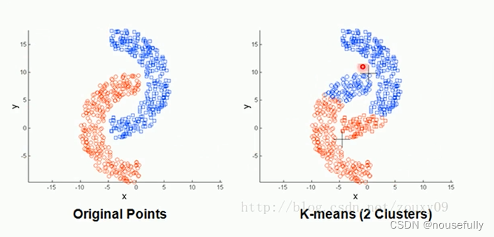 Q3:存在局限性,如下面这种非球状的数据分布就搞不定了: (可以根据密度分类算法)
