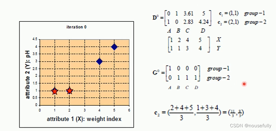 2.分别计算剩下的元素到k个子集重心的距离(这里的距离也可以使用欧氏距离) , 根据距离将这些元素分别划归到最近的子集。
