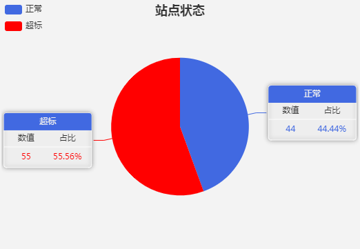 {b}: {c} ({d}%)"},legend: {orient: 'vertical',x: 'left',data:['正常','超标']},series: [{name:'站点状态',type:'pie',radius: [0, '55%'],label: {align: 'left',normal: {formatter: ['{title|{b}}{abg|}',' {valueHead|数值}{rateHead|占比}','{hr|}',' {value|{c}}{rate|{d}%}'].join('\n'),backgroundColor: '#eee',borderColor: '#fff',shadowColor: 'rgba(0, 0, 0, 0.4)',shadowBlur: 10,borderWidth: 1,borderRadius: 4,rich: {title: {color: '#eee',align: 'center'},abg: {backgroundColor: '#4169e1',width: '100%',align: 'right',height: 25,borderRadius: [4, 4, 0, 0]},valueHead: {color: '#333',height: 24,width: 30,align: 'center',padding: [0, 20, 0, 10]},value: {height: 30,width: 30,align: 'center',padding: [0, 20, 0, 0]},rateHead: {color: '#333',height:24,width: 30,align: 'center',padding: [0, 20, 0, 10]},rate: {height: 30,width: 30,align: 'center',padding: [0, 10, 0, 10]},hr: {borderColor: '#fff',width: '100%',borderWidth: 0.5,height: 0}}}},data:[{value:44, name:'正常', itemStyle:{color : '#4169e1'}},{value:55, name:'超标',itemStyle:{color : 'red'}}]}]};